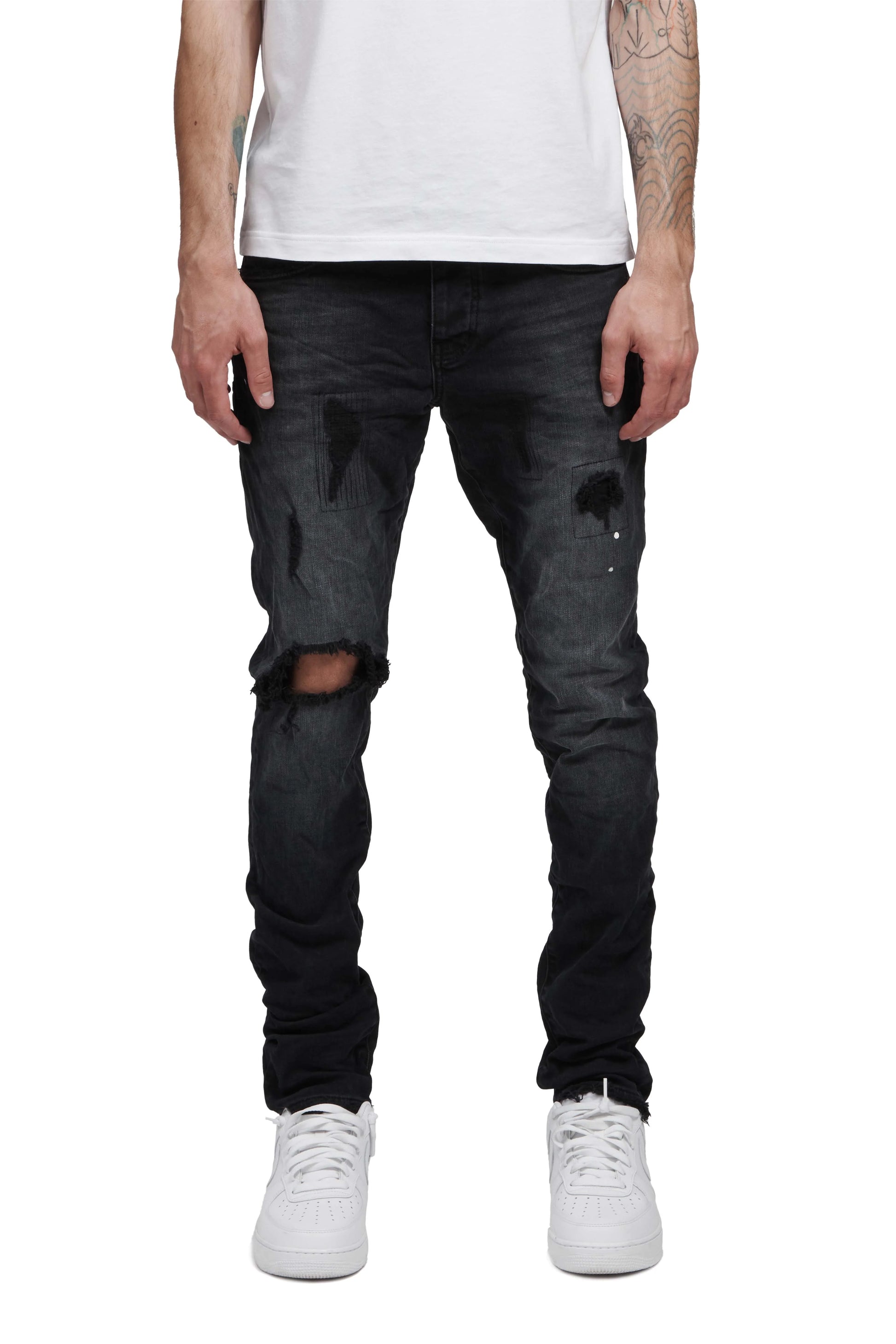 Constructed in a dark black wash, this elevated denim is designed with rip and repair and blowout detailing at the knee, lighting fading, and finished with subtle hand-applied paint splatter for an edgy yet vintage feel.